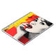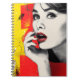 Dos mujeres están representadas en un estilo de arte pop vibrante, una en tonos azules y amarillos y la otra en escala de grises con lápiz labial rojo audaz. El fondo combina los tonos abstractos en tonos rojos y amarillos.