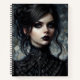 El cuaderno/diario presenta obras de arte de pintura al óleo de una joven gótico de estilo victoriano negro. Es sorprendente, con una mirada intensa dirigida al espectador. Su aspecto también podría ser visto como brujo o vampirico. Resumen de fondo texturado en varios matices de gris y otros colores neutros.