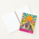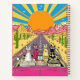 Journal in an illustration of five stylishly dressed cats wearing sunglasses ride in a pink convertible through a vibrant desert landscape. The backdrop features cacti, mountains, and a radiant, setting sun. The whimsical, pop-art style evokes a playful, retro road trip vibe.