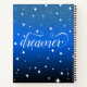 Añade vibraciones creativas a tus reflexiones con este diario, que cuenta con una miríada de estrellas, cercanas y lejanas, relucientes contra un fondo del cielo azul medianoche que se transforma en negro, con la palabra "soñador", ambientada en un elegante guión fluido. Personalice como desee. Diseño © W.H. Sim. Ver más en zazzle.com/expressionsoccasions
