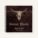 Rústico cráneo de vaca toro boda de vaquero de campo occidental cena libro de invitados de bienvenida cuaderno de notas de espiral. Personalizar tu tipografía. Estilo de casa de campo de textura marrón para novia y novio. Antiguo y salvaje estilo vintage del oeste. Guay, diseño moderno y de moda para animales de granja. Derechos de imagen de Marg Seregelyi Photography.