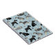 Perros Schnauzer en negro, sal, pimienta y abrigos negros y plateados sentados, de pie y girando con huesos de perro dispersos y huellas de pata en un fondo azul claro.