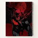 Este poderoso gráfico ilustra a Batman en una posición de acción dinámica, saltando en el fondo de una luna roja y un tormentoso horizonte gótico. El ilustracion está salpicado de tonos rojos y negros, lo que pone de relieve la intensidad y el peligro del momento. Batman es representado en movimiento, luchando con un gancho en la mano, listo para enfrentar los peligros que acechan en la noche. La ciudad que está debajo de él es representada en un detallado estilo de wireframe, sugiriendo su complejidad y la profundidad de los secretos que contiene. Las lluvias caen por toda la escena, lo que aumenta la dramática tensión y la sensación de una batalla en alto riesgo contra el crimen. La obra de arte transmite el implacable impulso de Batman y su papel como héroe oscuro en una ciudad que nunca duerme, capturando su esencia como guardián y protector silencioso de Gotham.