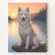Samoyedo sentado junto a un lago al atardecer. Agrega esta imagen a otros productos. Rompecabezas, planificadores, cuadernos, adornos, baldosas, fundas para teléfonos y más con este diseño en mis tiendas. Agrega tu propio texto también. Muchos animales en mi tienda.