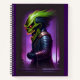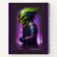 Una cabeza de demonio personalizado con pelo verde, dientes afilados y ojos rojos en un fondo morado y negro crea un cuaderno de espiral impresionante para cualquier ventilador metalizado pesado.