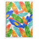 A seamless pattern of watercolor feathers in vivid blue, green, orange, and yellow hues.