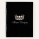 Este cuaderno de recetas en espiral se muestra en negro elegante con una impresión de una corona plateada brillante en la cubierta y tiene un papel gráfico dentro. Debajo de la corona está la palabra de ejemplo "Diseños domésticos" en un guión elegante esperando a que usted personalizara su tema. Cubierta posterior de color sólido negro con una pequeña corona plateada en el fondo. Puede personalizar este bloc de notas y elegir entre otros estilos de papel y color de enlace, o comprar como se muestra.
