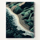 Serene Shores: This stunning top-down illustration captures the harmony of land and sea, featuring waves gently breaking on sandy beaches with lush green mountains in the background. Rendered in soothing shades of dark blue-green, the artwork evokes a sense of tranquility and balance. The intricate detail of the ocean’s patterns meeting the shore, paired with the trees lining the water’s edge, enhances the peaceful atmosphere. Created in a woodcut print style with simple lines and a flat design, the piece is reminiscent of hand-drawn animation, offering a timeless, serene depiction of nature’s beauty.