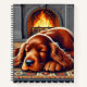 Un perrito irlandés Setter duerme tranquilamente sobre una alfombra estampada cerca de una gran chimenea, rodeado por un interior rústico y acogedor con un ambiente cálido y acogedor.