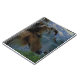 Foto parcialmente transparente de mi estante mirando un lago y un hermoso paisaje.