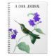 Un diseño de cuaderno y diario fresco con un colibrí verde brillante encaramado en un delicado tallo verde con flores moradas oscuras.