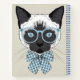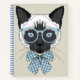 Este diseño presenta un gato siamés vestido con un par azul de gafas y corbata de arco a cuadros.