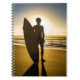 Un surfista de pie en la playa, con tablas de surf en la mano, frente al océano, colocado frente al sol naciente.