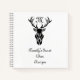 Un ilustracion de un impresionante estante de diez puntos sobre una base tribal negra, hecho con tinta negra. Entre las grandes antemas está la letra "M", m es corta para monograma y puede ser personalizada. Otro campo de texto dice: "Las recetas de ciervos secretos de la familia", también es personalizable. Un regalo ideal para el padre o padre que ama la caza de venados por carne y no por diversión.