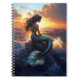 Una hermosa sirena se sienta en una orilla rocosa, su sinuosa cola resplandeciente en la puesta de sol dorada.