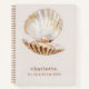Un fondo beige. Decoradas con una concha acuática, vieiras con perlas en el interior. Personalice y agregue un nombre y un texto. Para la escuela, trabajar como cuaderno de bocetos, diario y periodismo.