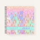 Un fondo de color iridiscente a la moda con unicornio y colores pastel de arcoiris en rosa, violeta, verde menta. Decorado con goteo en rosa, morado y con un patrón de unicornio de colores dorados. Personalice y agregue un nombre. El título: Sketchbook está escrito con una escritura a mano a la moda con letras con chispas. Para que los cambios sólo eliminen el nombre del ejemplo, deje los espacios o la emoji delante y después del nombre. Utilícelo como un cuaderno de bocetos, dibujando, tomando notas, haciendo ideas, escuela, trabajo en casa.