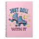 Ilustracion de estilo retro con el diseño de texto "Just Roll With It" y estrellas coloridas y decoración de patines