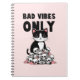 Envía tu lado atrevido y suavizado con este sorprendente cuaderno en espiral con un gato encarnizado rodeado de cráneos. La audaz frase 'Sólo malas vibraciones' agrega un giro rebelde, perfecto para los amantes de los gatos que adoptan una estética oscura y gótica. Este diseño único es ideal para los amantes de combinar el encanto felino con el arte atrevido y creativo.