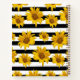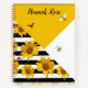 Este cuaderno de colores vivos presenta rayas negras y blancas con girasoles y un triángulo de amarillo y blanco. Hay dos abejorros y dos ladybugs volando por ahí. El dorso del cuaderno es el patrón rayado en blanco y negro con girasoles. Personalízalo en la parte superior con tu nombre.