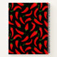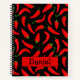 Un cuaderno divertido impreso con un patrón audaz de pimientos de chile rojo, en un fondo negro. Ambos lados están impresos con el mismo diseño. Cambie el nombre en la parte delantera para adaptarlo a sus necesidades. Un regalo perfecto para los adictos a la comida picante, los amantes de la pimienta, los chefs y los cocineros.