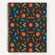Spiral notebook with a Halloween-themed cover. The front and back feature colorful patterns of pumpkins, ghosts, bats, and foliage on a dark background. The mood is festive and playful.