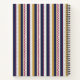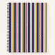 Spiral notebook with vertical stripes in navy blue, red, mustard yellow, and white. Wavy red lines and dots add a playful touch. The design is the same on the front and back.
