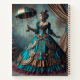 Una bella y peculiar cantante de circo victoriano de vapor vintage, de color azul y oro ornamentado con engranajes de reloj trenzados en su elegante vestido, se pone con su sombrilla en este vintage mundo de fantasía histórica.