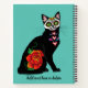 Un gato negro con el día del cráneo de azúcar muerto maquillada en un telón de fondo de verde azulado.
