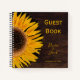Boda rústico de color amarillo girasol campestre de grano de madera marrón de la cena libro de invitados de la recepción de espiral keepsake. Hermoso diseño de flores impresas en personalizado. Derechos de imagen de Marg Seregelyi Photography.