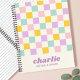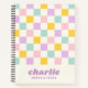 Portátil con un patrón de tablero de ajedrez rosa claro, amarillo, púrpura y azul acuático y tu nombre en un estilo retro, color púrpura con una línea de texto personalizado debajo. Todos los colores son personalizable.