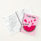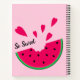 Este portátil rosa bonito está diseñado para contener sus recetas. Está decorada con una sola imagen de una jugosa tajada de sandía roja con un mordisco y un patrón de corazones que se desmoronan. El fondo es rosa pálido y se puede personalizar con tus palabras y tu nombre. La parte posterior del cuaderno también tiene el diseño de la sandía.