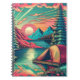Cuaderno temático de campamento. Los gráficos son de un camping de color rosa y verde azulado con una tienda, una puesta de sol, lagos y pinos.