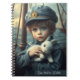 Cuaderno espiral de estética azul, con una ilustración de un niño sosteniendo su conejito de peluche en un tema náutico y texto personalizado.