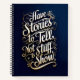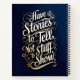 Este bonito cuaderno con espiral cuenta con un inspirador diseño tipográfico que te anima a emprender la aventura y vivir la vida al máximo. El fondo azul marino proporciona un rico y elegante lienzo para las cálidas letras de tonos dorados que dicen "Ten historias que contar, no cosas que mostrar". Los intrincados elementos decorativos y los elementos dibujados a mano que rodean el texto añaden un toque de brillo y arte, haciendo de este cuaderno una pieza visual llamativa y motivadora. Ya sea que lo uses como diario, planificador o cuaderno de bocetos, este cuaderno servirá como un recordatorio constante para buscar nuevas experiencias, explorar el mundo que te rodea y crear la vida de tus sueños