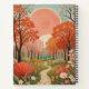 This vertical landscape painting captures a richly colored, magical forest scene. The dominant feature is a massive, textured, coral-pink sun or celestial body filling the upper center sky, casting a warm, enveloping glow over the entire setting. A winding path paved with light, irregular stones leads the viewer through a vibrant meadow. The foreground is dense with stylized wildflowers and lush greenery in shades of white, pink, and orange. The middle ground is defined by a forest line with trees displaying brilliantly red and orange autumnal foliage, contrasting with the dark, intricate bare branches that frame the composition. The background reveals rolling hills in cool blues and greens beneath a pale turquoise sky. The overall style is dreamlike, rich in detail, and evocative of a fantastical, harmonious autumnal day.