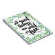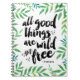 Todas las cosas buenas son salvajes y gratis. El diseño presenta la cita en un crujiente texto negro de pinceles rodeado de hojas botánicas verdes de la jungla en acuarela.