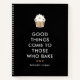 Cuaderno de recetas de moda en blanco y negro y falso purpurina de oro con "las cosas buenas vienen a los que hornean" escrito en la portada con una letra moderna bajo un quequito blanco con helado decorado con corazones dorados. Personaliza con tu nombre.