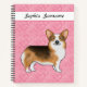 El original ilustracion personalizado de Destei de un abrigo tricolor de cabeza roja Pembroke galés raza perro con un color de fondo rosado con un patrón de corazones de diferentes tamaños. También hay un área de texto personalizable para un nombre u otro texto personalizado.