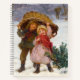 Vintage illustration of a boy and a girl joyfully dragging a holly tree through the winter forest while carrying a basket over their head to protect themselves from the falling snow. Nostalgic oil painting by English artist Frederick Morgan.