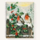 Vintage Christmas illustration of two little robins sitting on a fence with holly berries in the snow.