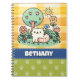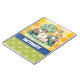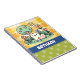 Un adorable cuaderno de un lindo gato personalizado de arte estilo doodle sentado tranquilamente en un hermoso jardín. El gato es de color crema pálido con rayas naranjas a lo largo de su cuerpo y cola. Ella descansa sobre hierba verde rodeada de flores rosas, azules y amarillas. En el fondo hay un árbol verde con fruta en forma de corazón y un sol amarillo feliz contra un cielo azul pálido. Este ilustracion caprichoso se adaptaría a cualquier edad, especialmente a los niños y a los amantes de los gatos. El fondo del ilustracion es un patrón de verificación amarillo. Debajo del ilustracion hay una banda azul con letras blancas para añadir tu nombre u otro texto a personalizar. Debajo hay un espacio verde con huellas de pata verde claro.