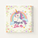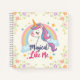 Un diseño caprichoso de cuaderno que muestra un unicornio pastel con una melena suave y fluida en tonos de rosa suave, lavanda, verde menta y azul bebé con el texto "Mágico como yo" rodeado de pequeñas flores. La expresión tranquila y soñadora del unicornio irradia tranquilidad.