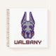 El logo de la mascota de la Universidad de Albany Great Dane muestra una elegante representación de la cabeza de un Gran Danés. El perro está ilustrado con líneas agudas y audaces en morado y gris, dándole una expresión feroz y segura de sí misma. Las orejas se sostienen alto, simbolizando la alerta y la fuerza. Debajo de la cabeza del Gran Danés está la palabra "UAlbany" escrita en letras de oro audaces y bloqueadas, delineadas en morado, reforzando la marca de la universidad. Este diseño representa a los equipos deportivos de la UAlbany, destacando el poder, la lealtad y la determinación.