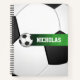 ¡Diseño deportivo divertido en un cuaderno de espiral para los futbolistas y los futbolistas! El diseño presenta una imagen de primer plano de una pelota de fútbol con el patrón de fútbol blanco y negro. Al otro lado del centro del diseño del fútbol hay un área para personalizar con tu nombre en divertido y blanco tipo de letra. El espacio que hay que personalizar es verde para que parezca terreno de fútbol y hay una pelota de fútbol a la izquierda. Este diseño de fútbol fresco es perfecto para los aficionados al deporte de vuelta a la escuela.