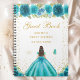 Este elegante y glamoroso libro de 16 personas cuenta con una hermosa princesa con el pelo de morena y piel clara en un verde azulado vestido de bolas azules. El texto combina el guión manuscrito y las fuentes sans serif modernas para un aspecto elegante y sofisticado. Los arreglos florales, las mariposas y los confeti dorados crean una perfecta mezcla de rústico y moda. Gráficos de www.etsy.com/uk/shop/SunflowerDayLove