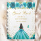 Este elegante y glamoroso libro de invitados para la fiesta de cumpleaños presenta una hermosa princesa con el pelo oscuro y la piel oscura en un verde azulado vestido de bolas azules. El texto combina el guión manuscrito y las fuentes sans serif modernas para un aspecto elegante y sofisticado. Los arreglos florales, las mariposas y los confeti dorados crean una perfecta mezcla de rústico y moda. Gráficos de www.etsy.com/uk/shop/SunflowerDayLove