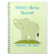 Cuaderno lindo de la fiesta de bienvenida al bebé hecho en un fondo verde claro y blanco del lunar, con los gráficos adorables de un elefante verde y azul claro de la tela escocesa. El texto azul es completamente adaptable adaptarse a sus necesidades de la ducha. Grande para que huéspedes escriban notas especiales a la mamá para ser y para enumerar los regalos recibidos. Personalice para su fiesta de bienvenida al bebé.