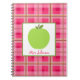 Un cuaderno espiral que ofrece un fondo de la tela escocesa rosada. Manzana verde dentro del cuadrado en el centro. Personalice con su nombre.