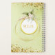 Un cuaderno elegante en tonos verdes mullidos con bandas doradas y flores.
